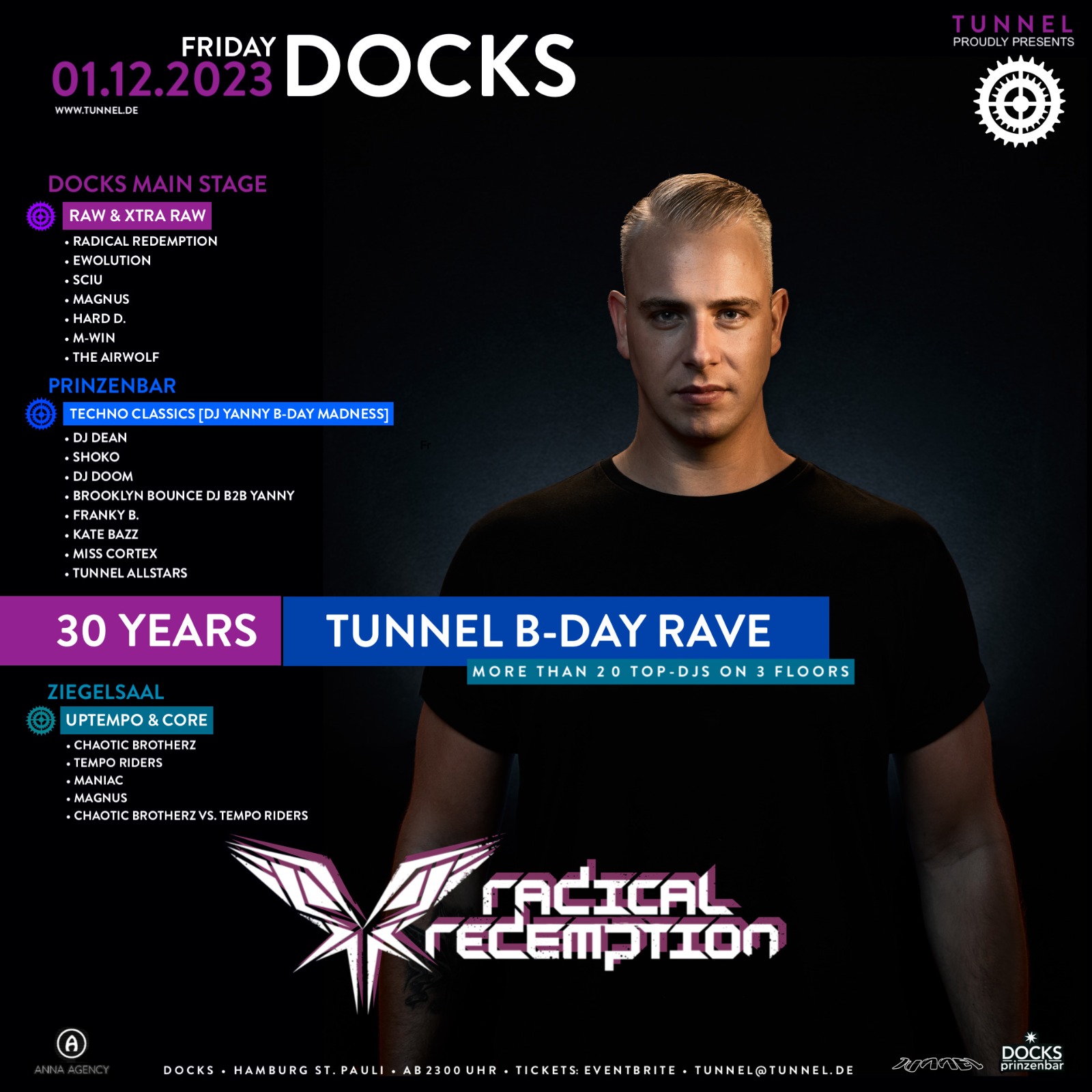 Die absolut fette 30 Jahre TUNNEL Geburtstagsparty kommt am Freitag den 01. Dezember 2023 in die Kultlocation DOCKS! Fantastisch - alles dabei: Auf 3 Floors wird gefeiert mit RAW & XTRA RAW, UPTEMPO, HARDCORE und TECHNO CLASSICS!